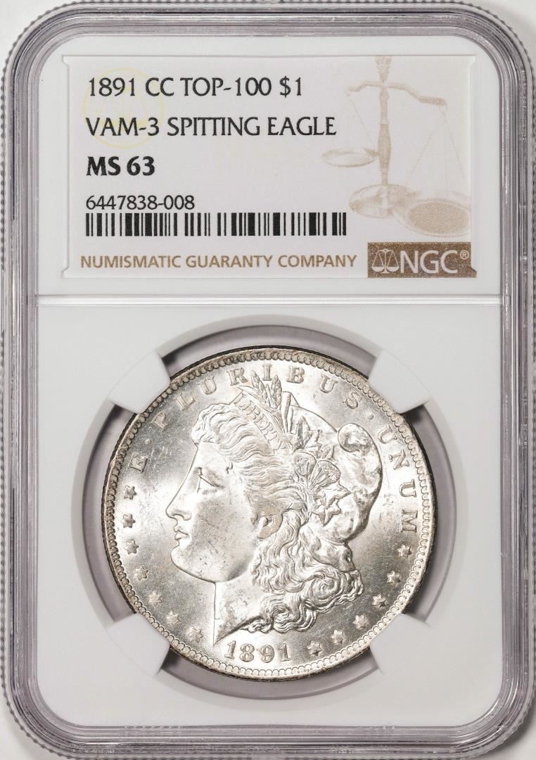 One 1891-CC VAM-3 Spitting Eagle Top-100 $1 Morgan Silver Dollar Coin NGC MS63. NGC Certified.