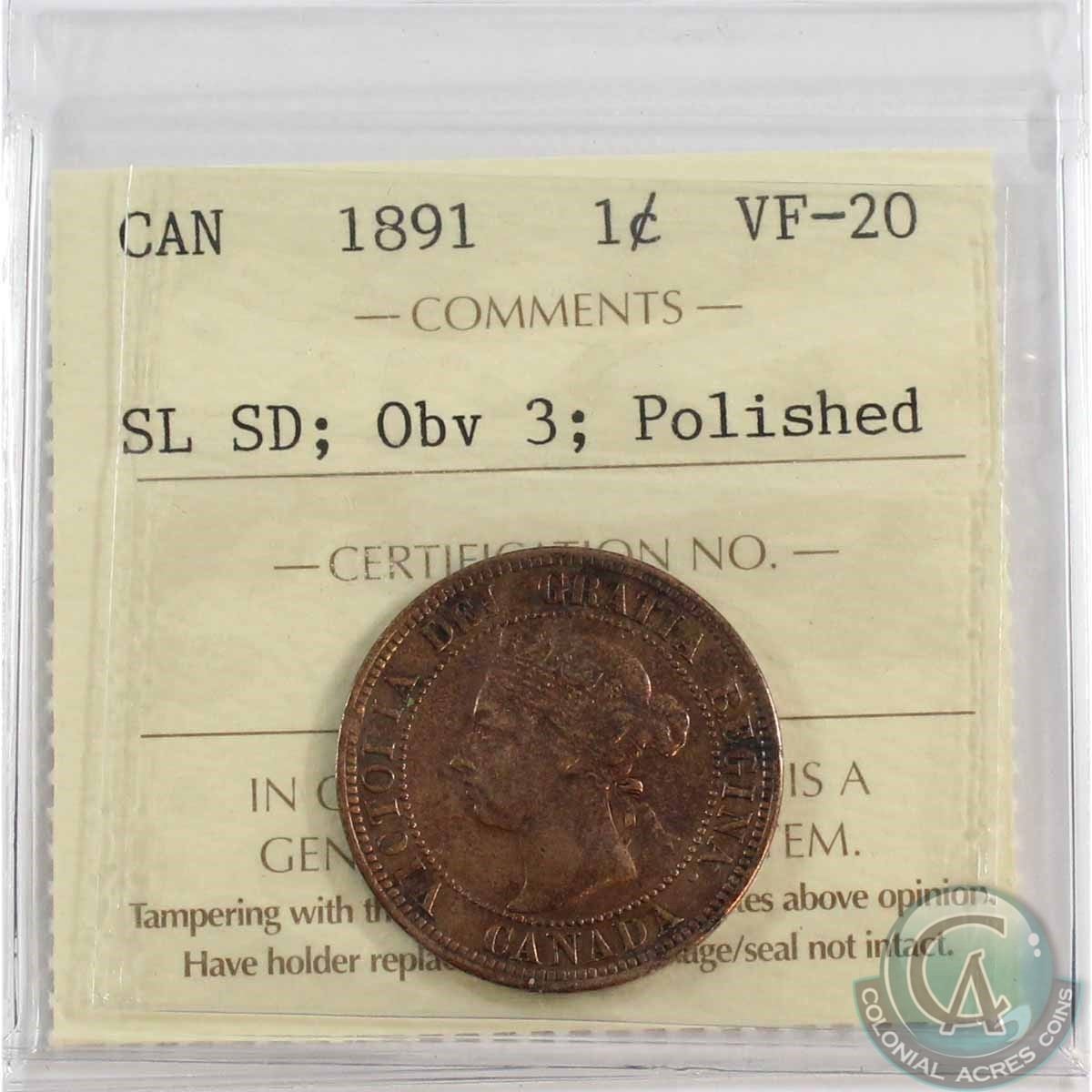 1891 Canada 1-cent SL SD Obv 3 ICCS Certified VF-20 (Polished)