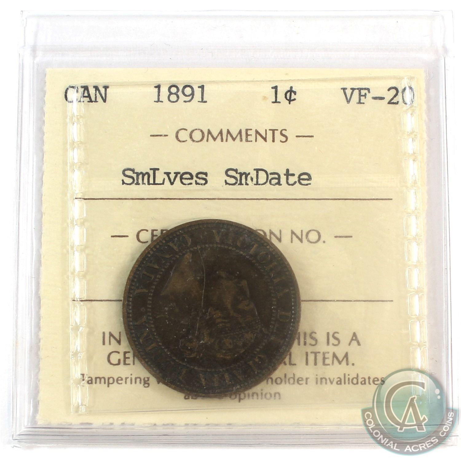 1891 Canada 1-cent Small Leaves Small Date ICCS Certified VF-20