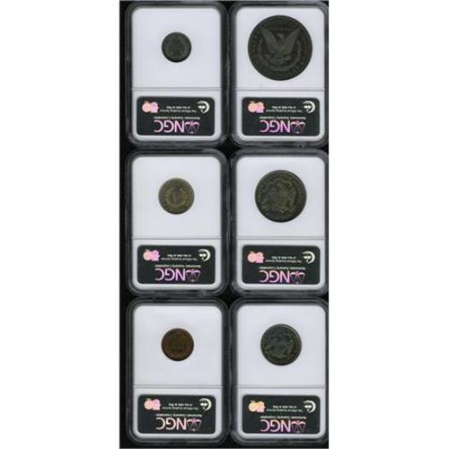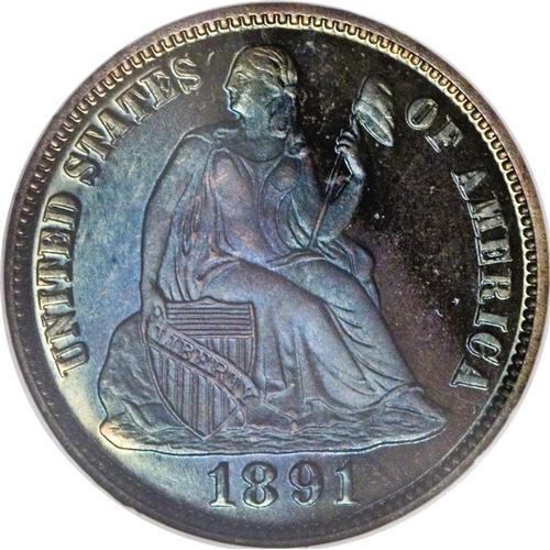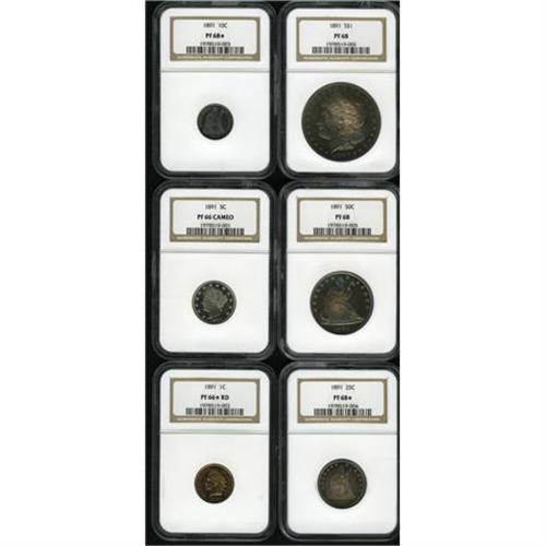 <B>1891 Certified Proof Set PR66 to PR68 NGC.</B></I> The set includes: <B>cent PR66 <img border='0' src='http://www.heritagecoins.com/images/star.gif' width=10 height=10> Red,</B></I> light orange obverse and deeper lilac-orange reverse; <B>nickel PR66 Cameo,</B></I> a lovely blue-gray Gem with champagne, lilac, and iridescent toning on the reverse; <B>dime PR68 S,</B></I> impressive cobalt-blue with deeper steel color on the reverse; <B>quarter PR68 S,</B></I> the obverse has intense sky-blue near the borders, around lilac and pale champagne, the reverse nicely toned in rich blue and pale green; <B>half PR68,</B></I> impressive blue, rose, amber, and lilac on the obverse, pale green, amber, and rose on the reverse; and a <B>dollar PR68,</B></I> toned in blue, golden-rose, amber, and violet on both sides.<BR><BR> NGC Census figures for these coins (11/06) are as follows:<BR>Cent: 1 in 66 S, 0 finer.<BR>Nickel: 22 in 66 Cameo, 6 finer.<BR>Dime: 1 in 68 S, 0 finer.<BR>Quarter: 2 in 68 S, 0 finer.<BR>Half dollar: 1 in 68, 0 finer.<BR>Dollar: 2 in 68, 0 finer.<BR> With the single exception of the Liberty nickel, every piece in this set is tied for the finest certified in its grade category.<BR><BR><b>Shipping:</b> Coin/Currency (<a target="_blank" href="http://www.heritageauctions.com/common/shipping.php">view shipping information</a>)