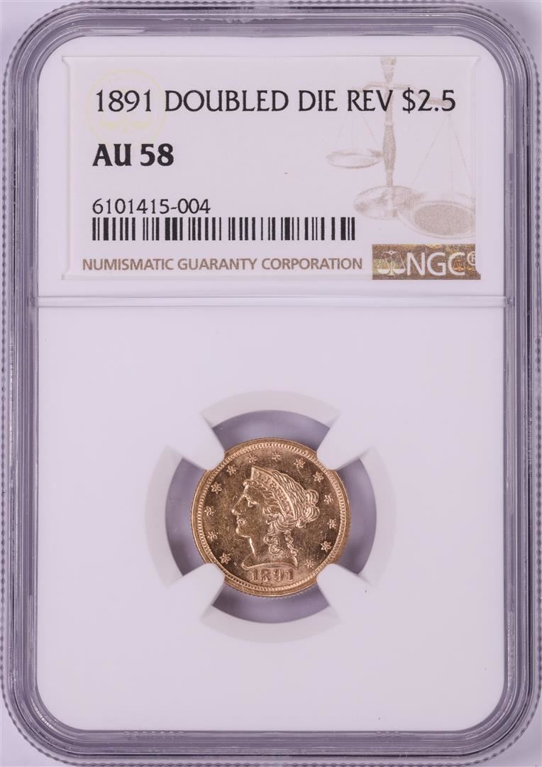 One 1891 Doubled Die Reverse $2 1/2 Liberty Head Quarter Eagle Gold Coin NGC AU58. NGC Certified.
