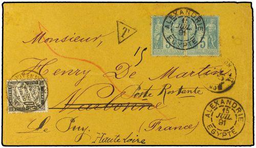 1891 Envelope to FRANCE bearing France Type Sage 5 c green (pair) (Yvert 75) tied by ALEXANDRIE EGYPTE double ring, underpaid with TAX handstamp and French postage due 30 c black (Yvert 18) applied and tied on arrival by HAUT LOIRE datestamp. Very fine combination.