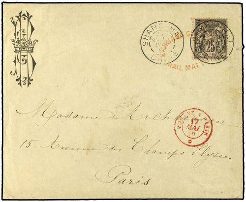 1891 Envelope to FRANCE written from KIUKIANG with oval KIUKIANG CUSTOMS MAIL MATTER on front in red and CUSTOMS KIUKIANG datestamp on reverse routed via the Customs Shanghai with transit and forwarded via the French Post Office bearing France Type Sage 25 cents black (Yvert 97) tied by SHANGHAI CHINE double ring with French entry cachet and PARIS arrival. Very fine and rare.