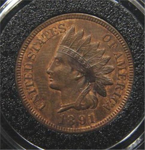 1891 U.S. INDIAN HEAD CENT. Coin is in circular case.