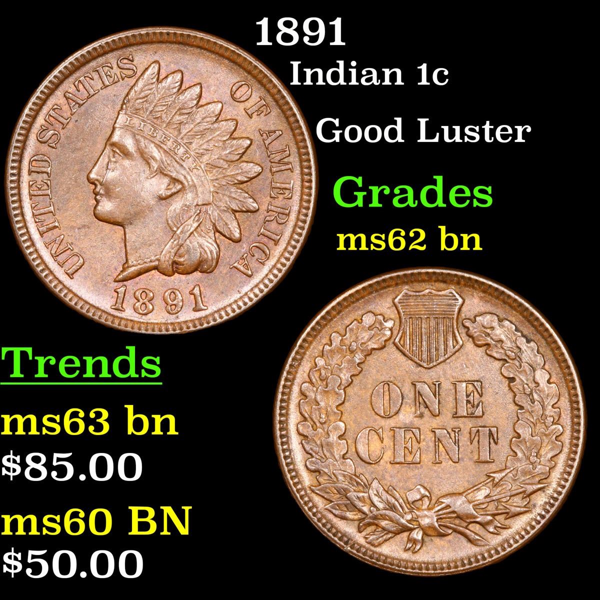 1891 Good Luster . Indian Cent 1c Grades Select Unc BN.