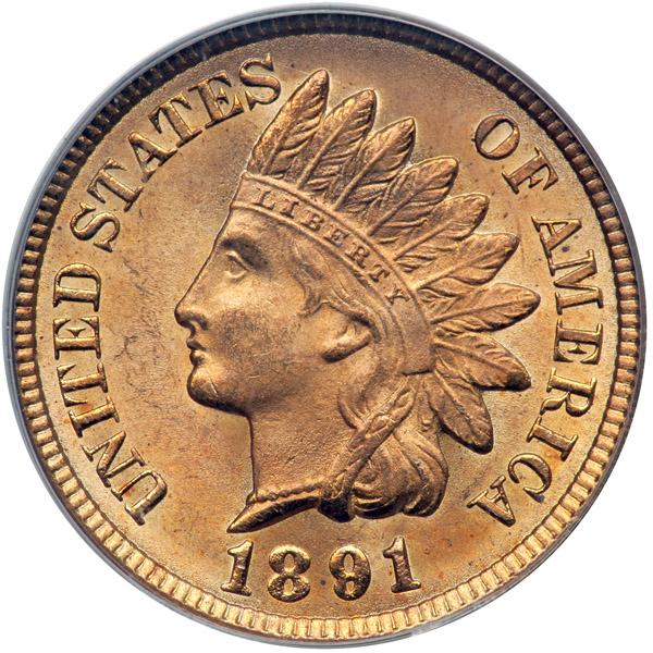 1891 Indian Head Cent. PCGS graded MS-65 Red. Accompanied by an Eagle Eye certificate. Housed in an Old Green Holder. The luster is dazzling red in color and comes alive when the viewer tilts the coin under a viewing light. Pop 67; 7 finer in 66RD (PCGS # 2180) .