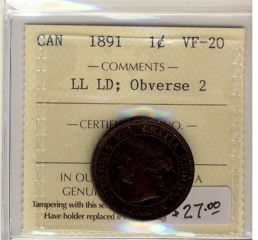 1891 LL LD Obv 2 1¢ ICCS VF20