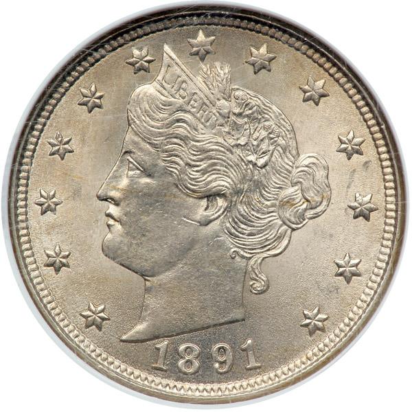 1891. NGC graded MS-65. Well struck and untoned with streaming mint luster flowing across the surface on both sides. Pop 66; 17 in 66, 1 in 67.