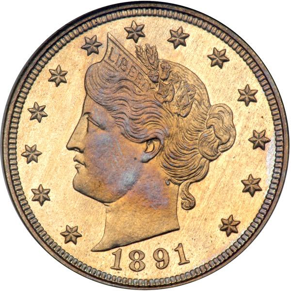1891 Liberty Nickel. NGC graded Proof 66. Light even toning. Only 2,350 pieces struck. The mint reflectivity rolls around both sides with a pleasing sheen, and none of the features reveal any bothersome distractions. Desirable with this precision Proof strike. Pop 23; 5 finer .