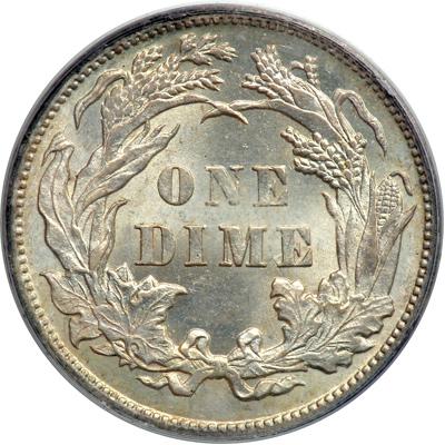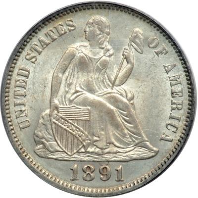 1891 Liberty Seated Dime. PCGS graded MS-64. Lightly toned. In an old green label holder. Final year of the seated Liberty Type. By 1891, a great debate rages across the country whether silver should be the money of the land or gold. A presidential election the next year focused on the debate. The gold-standard faction won the seat (PCGS # 4706) .