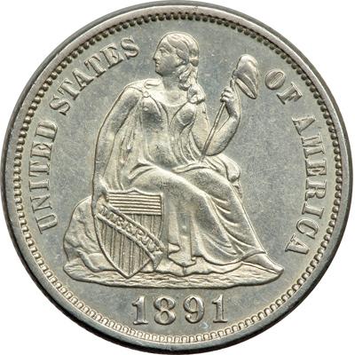 1891 Liberty Seated Dime. Choice with frosty luster somewhat muted on both sides (PCGS # 4706) .