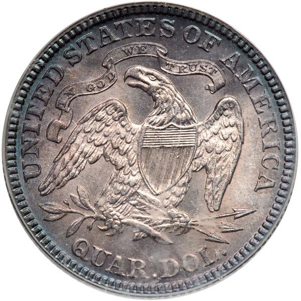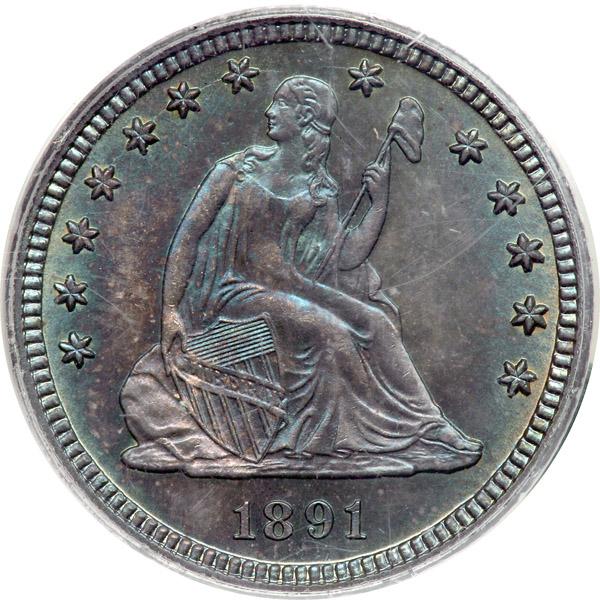 1891 Liberty Seated Quarter Dollar. PCGS graded MS-66 PQ. Lovely blue-green to seascape natural toning on the obverse and in our opinion a Premium Quality coin for the grade. Final year of issue. The Seated Liberty Quarter Dollar was a workhorse denomination for more than 60 years in the formative years of America's growth into a mighty world class industrial powerhouse (PCGS # 5524) .