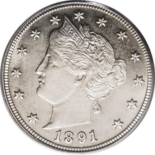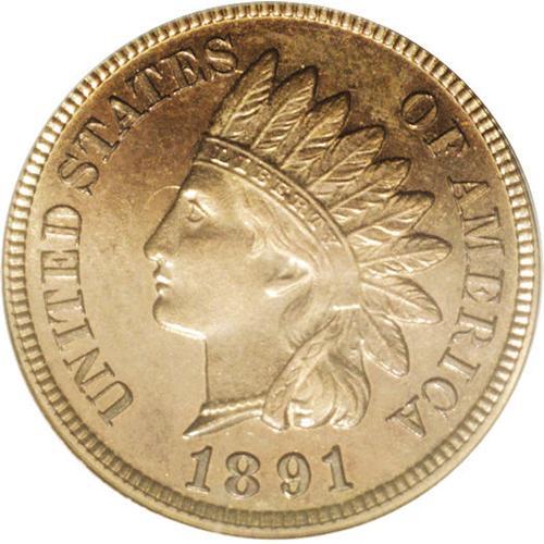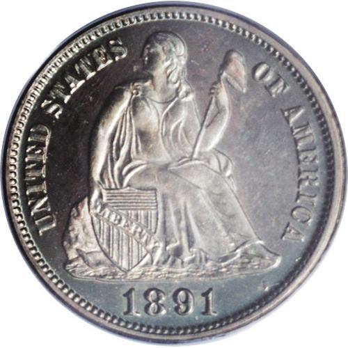 <B>1891 Proof Set PCGS.</B></I> This set includes: <B>Cent PR64 Brown,</B></I> medium brown with pale blue and iridescent toning; <B>Nickel PR64,</B></I> light gray with hints of iridescent toning and light cameo contrast; <B>Dime PR64,</B></I> deeply toned with vivid blue-green color and some contrast between the devices and the fields; <B>Quarter PR64,</B></I> magenta and blue on the obverse with pale blue-gray color on the reverse; <B>Half Dollar PR63,</B></I> attractive lilac and sea-green color; and a <B>Silver Dollar PR62,</B></I> faint champagne at the central obverse with the balance toned in lilac and blue.