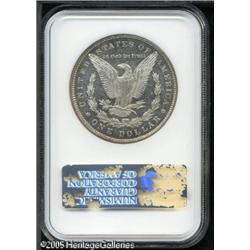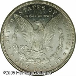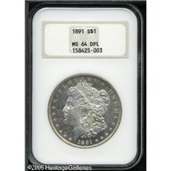 <B>1891<img border='0' src='http://www.heritagecoins.com/images/star.gif' width=10 height=10>$1 MS64 Deep Mirror Prooflike NGC.</B></I> The 1891 Morgan is surprisingly elusive with deeply reflective mirrors such as seen on this coin, and those surviving at the Choice level are legitimately rare. Offered here is mostly brilliant example with heavily frosted devices that provide good field-to-device contrast. Grade limiting blemishes are primarily limited to the cheek area on Liberty's portrait and the left obverse field. Lot:10348