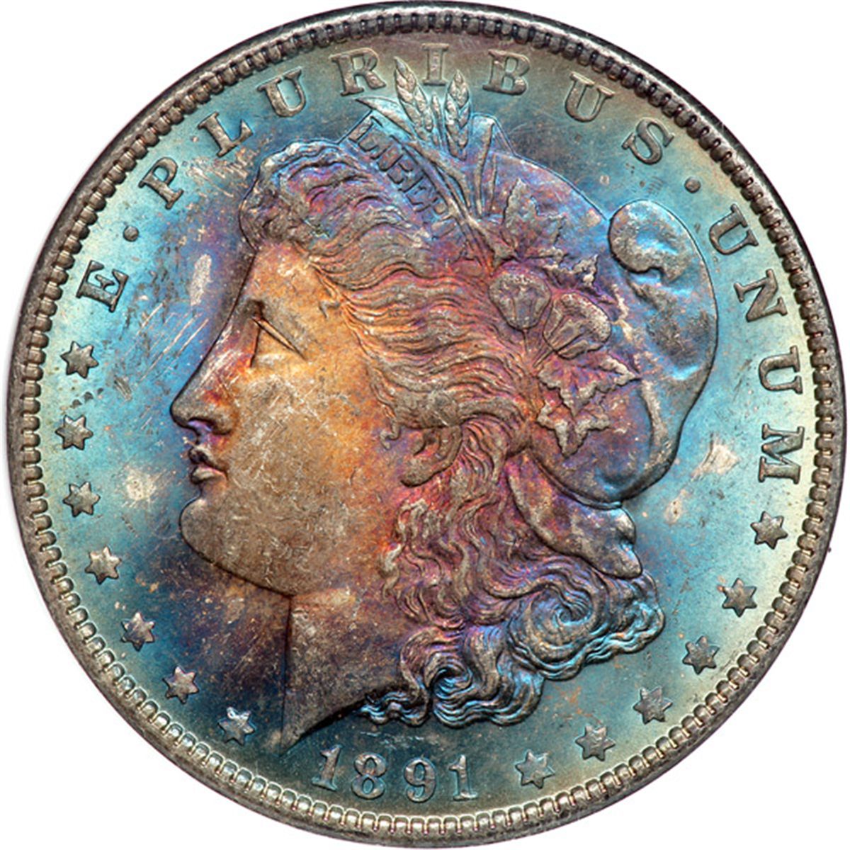 1891 Morgan Dollar. NGC graded MS-65 Star. Both sides display intense blue toning. Fully lustrous - an important and rare feature for this not all that well preserved issue -- the surfaces display dominant cartwheel sheen which supports the intense, iridescent color all the more. Combined, they almost mesmerize the onlooker! Almost everyone likes to seek a coin that was struck with precision and care by the dies in the outer margins and on all legends that you'd expect; here too, the inner designs were also left crisply detailed by the imprint of the dies. Pop 2; 2 finer in 66 (PCGS # 7204) .