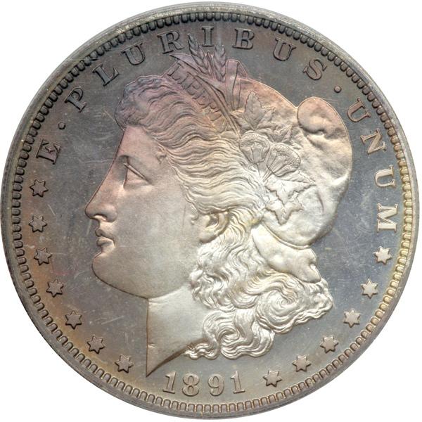 1891 Morgan Dollar. PCGS graded Proof 68 Cameo. Lovely blue and lilac toning. Only 650 Proofs struck. Strong eye appeal characterizes this Superb Proof Morgan Dollar. Its visual allure is based on a combination of the technical perfection of the coin's surfaces and the multiple gradations of deep toning that cover much of each side. An additional element of beauty is seen in the spotlight-like, untoned white circles, offset on the obverse, and a more central on the reverse. These spotlights of brilliance endow the coin with a contrast against the pleasant smoky-crimson to blue-green toning. The central devices are sharp and well defined, this being uncommon on some Proof dollars from the '80s and '90s. As a point of interest, perhaps as many as half of the surviving 1891 Proofs show central softness. This coin, regarded from the point of the specialist's critical eye and revealing magnifying lens, appears nearly perfect with exceptional visual appeal. It is the only Cameo Proof 68 certified by PCGS of this date, and is tied for finest certified honors with two coins graded the same by NGC. Pop 1; none finer at PCGS (PCGS # 87326) .