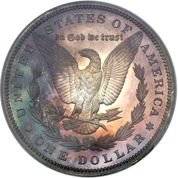 1891 Morgan Dollar. PCGS graded Proof 68 Cameo. Rich gold and blue toning shading into lovely dusky lavender. Only 650 pieces struck. Strong eye appeal characterizes this Superb Proof Morgan Dollar. Its visual allure is based on a combination of the technical perfection of the coin's surfaces and the multiple gradations of deep toning that cover much of each side. An additional element of beauty is seen in the spotlight-like, untoned white circles, offset on the obverse, and a more centered on the reverse. These spotlights of brilliance endow the coin with a contrast against the pleasant toning. The central devices are sharp and well defined, this being uncommon on some Proof dollars from the '80s and '90s. As a point of interest, perhaps as many as half of the surviving 1891 Proofs show central softness. This coin, regarded from the point of the specialist's critical eye and revealing Eschenbach magnifying lens, appears nearly perfect with exceptional visual appeal. Pop 1; none finer at PCGS (PCGS # 87326) .