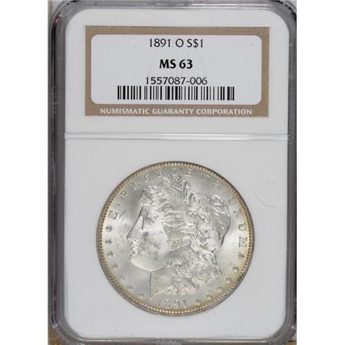<B>1891-O $1 MS63 NGC.</B></I> NGC Census: (1161/834). PCGS Population (1623/1095). Mintage: 7,954,529. Numismedia Wsl. Price for NGC/PCGS coin in MS63: $279. (#7208)<BR><BR><b>Shipping:</b> Coins & Currency (<a target="_blank" href="http://www.heritageauctions.com/common/shipping.php">view shipping information</a>)