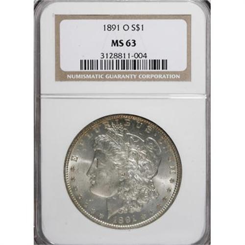 <B>1891-O $1 MS63 NGC.</B></I> NGC Census: (1212/880). PCGS Population (1689/1205). Mintage: 7,954,529. Numismedia Wsl. Price for NGC/PCGS coin in MS63: $300. (#7208)<BR><BR><B>Coin Engraver:</B> George T. Morgan<BR><BR><b>Shipping:</b> Coins & Currency (<a target="_blank" href="http://www.heritageauctions.com/common/shipping.php">view shipping information</a>)