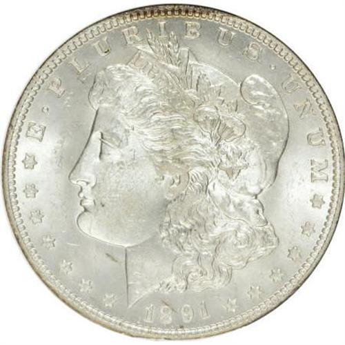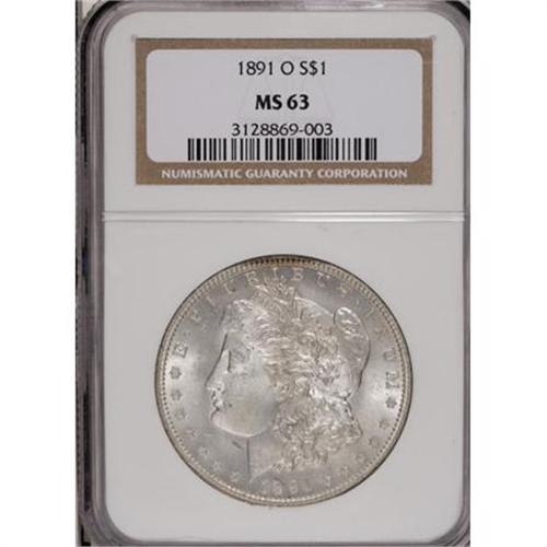 <B>1891-O $1 MS63 NGC.</B></I> NGC Census: (1213/880). PCGS Population (1692/1205). Mintage: 7,954,529. Numismedia Wsl. Price for NGC/PCGS coin in MS63: $300. (#7208)<BR><BR><B>Coin Engraver:</B> George T. Morgan<BR><BR><b>Shipping:</b> Coins & Currency (<a target="_blank" href="http://www.heritageauctions.com/common/shipping.php">view shipping information</a>)