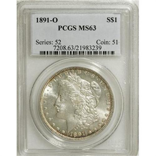<B>1891-O $1 MS63 PCGS.</B></I> PCGS Population (1622/1094). NGC Census: (1171/845). Mintage: 7,954,529. Numismedia Wsl. Price for NGC/PCGS coin in MS63: $300. (#7208)<BR><BR><B>Coin Engraver:</B> George T. Morgan<BR><BR><b>Shipping:</b> Coins & Currency (<a target="_blank" href="http://www.heritageauctions.com/common/shipping.php">view shipping information</a>)