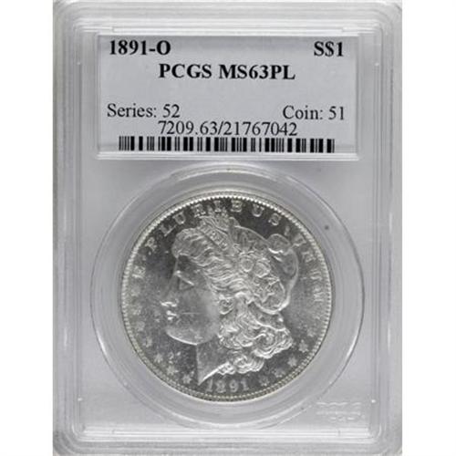 <B>1891-O $1 MS63 Prooflike PCGS.</B></I> Flashy and brilliant, with intense reflectivity in the lightly marked fields and sharply struck design elements. This issue is rare in Prooflike condition. Population: 19 in 63 Prooflike, 10 finer (6/07).<BR><I>From the Diamond Head Collection.</B></I><BR><BR><B>Coin Engraver:</B> George T. Morgan<BR><BR><b>Shipping:</b> Coins & Currency (<a target="_blank" href="http://www.heritageauctions.com/common/shipping.php">view shipping information</a>\)