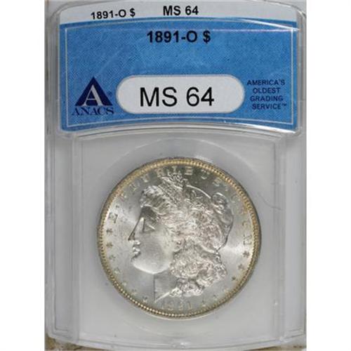 <B>1891-O $1 MS64 ANACS.</B></I> NGC Census: (773/72). PCGS Population (1022/72). Mintage: 7,954,529. Numismedia Wsl. Price for NGC/PCGS coin in MS64: $670. (#7208)<BR><BR><B>Coin Engraver:</B> George T. Morgan<BR><BR><b>Shipping:</b> Coins & Currency (<a target="_blank" href="http://www.heritageauctions.com/common/shipping.php">view shipping information</a>\)