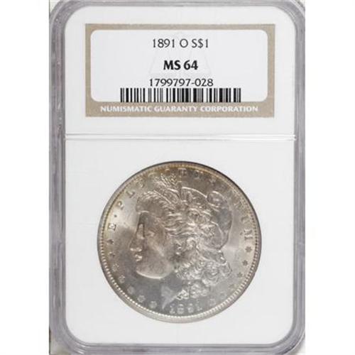 <B>1891-O $1 MS64 NGC.</B></I> Both sides show pleasing peripheral definition, though the highpoints show softness on this New Orleans near-Gem. The lower obverse and the reverse are largely untoned, while the rest of the coin shows lovely peach-orange patina. A pleasing example of this popular issue.<BR><BR><B>Coin Engraver:</B> George T. Morgan<BR><BR><b>Shipping:</b> Coins & Currency (<a target="_blank" href="http://www.heritageauctions.com/common/shipping.php">view shipping information</a>)