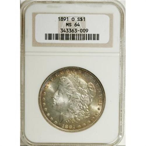 <B>1891-O $1 MS64 NGC.</B></I> NGC Census: (779/76). PCGS Population (1070/81). Mintage: 7,954,529. Numismedia Wsl. Price for NGC/PCGS coin in MS64: $670. (#7208)<BR><BR><B>Coin Engraver:</B> George T. Morgan<BR><BR><b>Shipping:</b> Coins & Currency (<a target="_blank" href="http://www.heritageauctions.com/common/shipping.php">view shipping information</a>)
