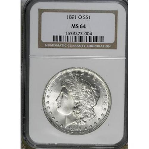 <B>1891-O $1 MS64 NGC.</B></I> Well-defined for this New Orleans issue with essentially untoned surfaces that offer strong, swirling luster. Minimally marked and attractive. NGC has graded just 76 pieces as Gem or better (1/08).<BR><BR><B>Coin Engraver:</B> George T. Morgan<BR><BR><b>Shipping:</b> Coins & Currency (<a target="_blank" href="http://www.heritageauctions.com/common/shipping.php">view shipping information</a>)