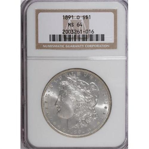 <B>1891-O $1 MS64 NGC.</B></I> Pleasing luster adorns both sides of this near-Gem, and the design elements show nice definition for an O-mint example. What appear to be specks of dirt are noted in the left reverse.<BR><I>From The Silver Spur Collection of Morgan Dollars.</B></I><BR><BR><B>Coin Engraver:</B> George T. Morgan<BR><BR><b>Shipping:</b> Coins & Currency (<a target="_blank" href="http://www.heritageauctions.com/common/shipping.php">view shipping information</a>)