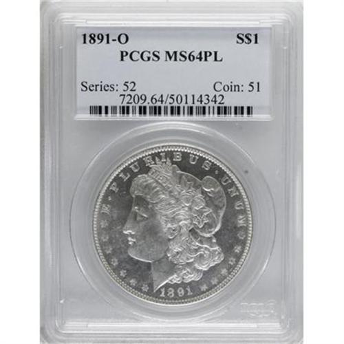 <B>1891-O $1 MS64 Prooflike PCGS.</B></I> The 1891-O is best known for weak strikes, but specialists also know that prooflike pieces are rare. The present faintly toned near-Gem has pleasantly reflective fields, which are also surprisingly smooth aside from minor upper reverse marks. The portrait is beautifully unabraded. The strike is a bit above average in the centers, although the date and STATES lack a full impression. Population: 10 in 64 Prooflike, 0 finer (6/07).<BR><I>From the Diamond Head Registry Set of Prooflike Dollars.</B></I><BR><BR><B>Coin Engraver:</B> George T. Morgan<BR><BR><b>Shipping:</b> Coins & Currency (<a target="_blank" href="http://www.heritageauctions.com/common/shipping.php">view shipping information</a>\)