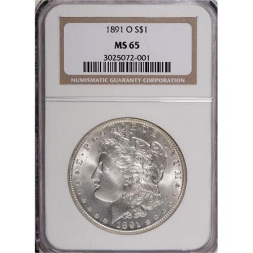 <B>1891-O $1 MS65 NGC.</B></I> Satiny silver surfaces and brilliant mint luster are evident on this entirely untoned Gem Morgan dollar. The strike is far finer than usually encountered for this issue, with nearly full hair detail over Liberty's ear, and considerable breast detail on the reverse. Census: 74 in 65, 2 finer (1/08).<BR><I>From The Oxford Collection.</B></I><BR><BR><B>Coin Engraver:</B> George T. Morgan<BR><BR><b>Shipping:</b> Coins & Currency (<a target="_blank" href="http://www.heritageauctions.com/common/shipping.php">view shipping information</a>)