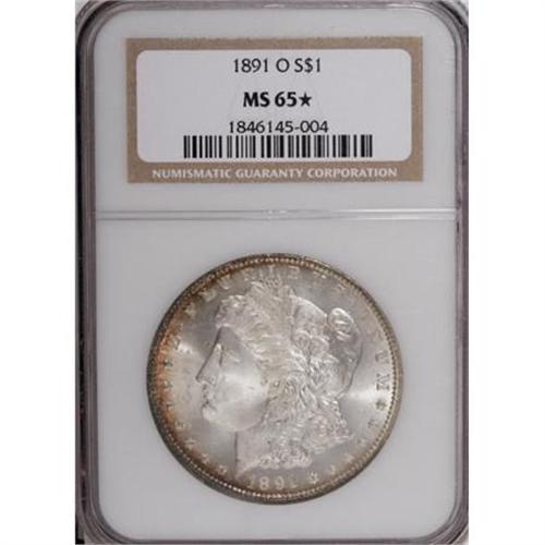 <B>1891-O $1 MS65 </B></I><img src="/images/star.gif" width="10" height="10" alt="" border="0"><B> NGC.</B></I> Fire-red patina illuminates the left borders of this thoroughly lustrous Gem. The "sweet spot" of Liberty's cheek is clean, and mentionable marks are absent. The centers are slightly blunt, as nearly always for this notoriously strike-challenged issue. Census: 2 in 65 <B><img src="/images/star.gif" width="10" height="10" alt="" border="0"></B></I>, none finer with a star designation (1/08).<BR><BR><B>Coin Engraver:</B> George T. Morgan<BR><BR><b>Shipping:</b> Coins & Currency (<a target="_blank" href="http://www.heritageauctions.com/common/shipping.php">view shipping information</a>)
