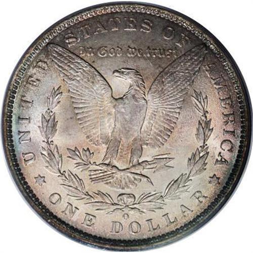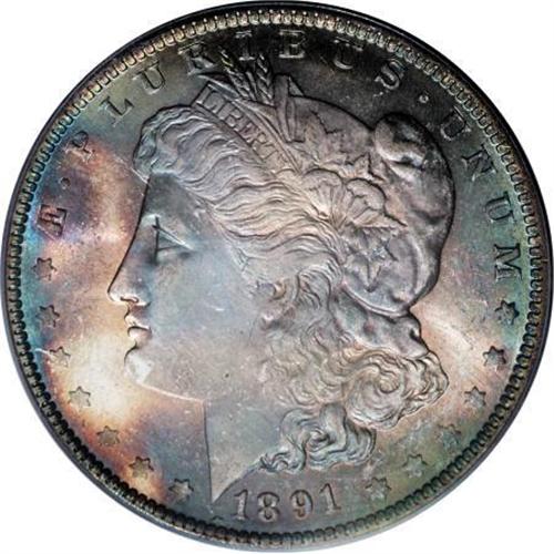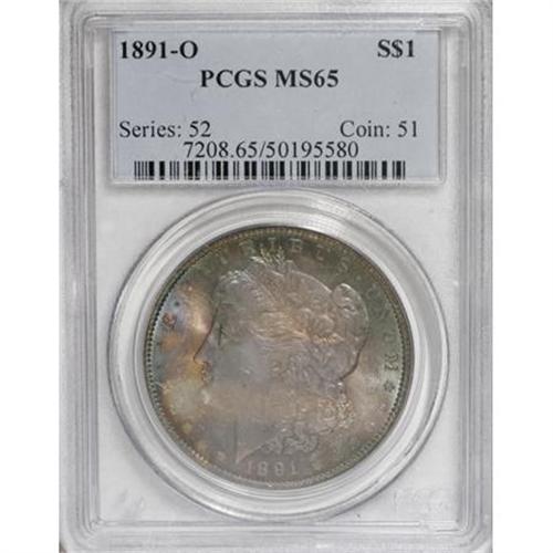 <B>1891-O $1 MS65 PCGS.</B></I> Supremely lustrous, the obverse surfaces of this Gem are draped in magenta, purple, gunmetal-blue, and copper-green. The reverse is bathed with apricot and amber hues. A bit weakly struck, as always, on the central details; there are no obvious or distracting blemishes on either side of this beautiful '91-O dollar. Population: 76 in 65, 0 finer (6/07). <BR><BR><B>Coin Engraver:</B> George T. Morgan<BR><BR><b>Shipping:</b> Coins & Currency (<a target="_blank" href="http://www.heritageauctions.com/common/shipping.php">view shipping information</a>\)