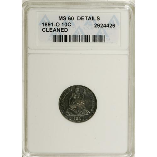 <B>1891-O 10C --Cleaned--ANACS. MS60 Details.</B></I> NGC Census: (0/143). PCGS Population (3/132). Mintage: 4,540,000. Numismedia Wsl. Price: $125. (#4707)<BR><BR><b>Shipping:</b> Coin/Currency (<a target="_blank" href="http://www.heritageauctions.com/common/shipping.php">view shipping information</a>)
