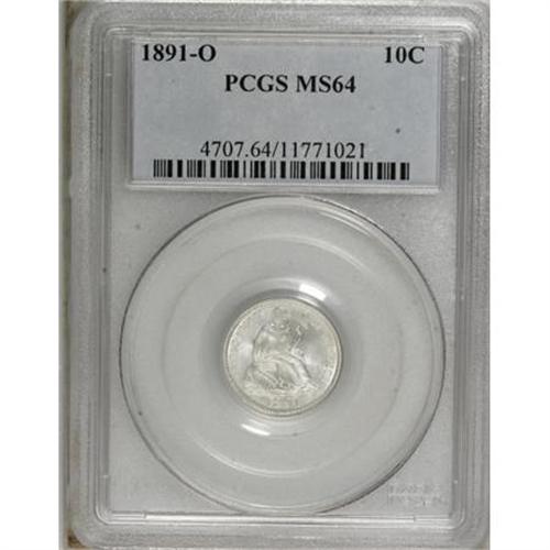 <B>1891-O 10C MS64 PCGS.</B></I> PCGS Population (45/24). NGC Census: (46/34). Mintage: 4,540,000. Numismedia Wsl. Price for NGC/PCGS coin in MS64: $480. (#4707)<BR><BR><B>Coin Engraver:</B> Christian Gobrecht<BR><BR><b>Shipping:</b> Coins & Currency (<a target="_blank" href="http://www.heritageauctions.com/common/shipping.php">view shipping information</a>)