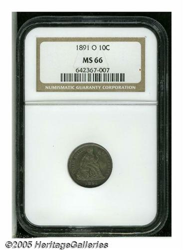 <B>1891-O<10C> MS66 NGC.</B></I> Aquamarine and rose colors illuminate this lustrous and sharply struck premium Gem. The first New Orleans Dime issue in more than thirty years, the 1891-O is obtainable in Mint State, but is a rarity above the MS65 level. A series of small cuds, as made, are noted along the lower obverse rim.