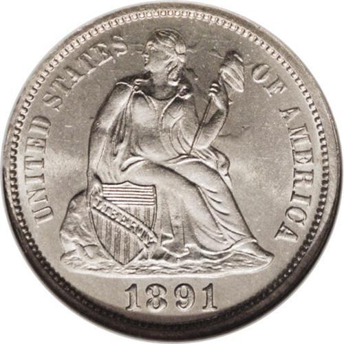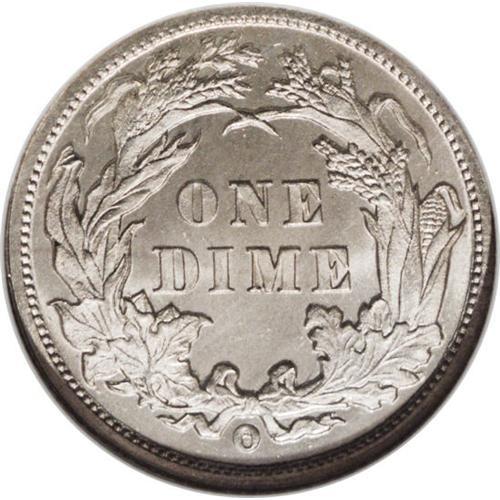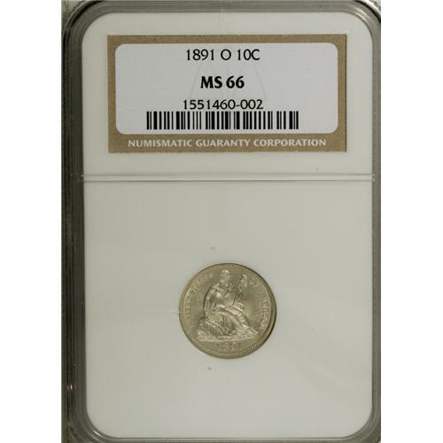 <B>1891-O 10C MS66 NGC.</B></I> Fortin-106a. This variety is distinguished by its clashed obverse die, repunching of the 8 and 9 in the date, and extra metal within the mintmark that makes the O take on the appearance of the Greek letter <I>theta.</B></I> Even those without an interest in the fine points of Seated dime varieties should take notice of the strongly lustrous and practically untoned surfaces of this detailed piece. Census: 7 in 66, 1 finer (11/06).<BR><BR><b>Shipping:</b> Coin/Currency (<a target="_blank" href="http://www.heritageauctions.com/common/shipping.php">view shipping information</a>)