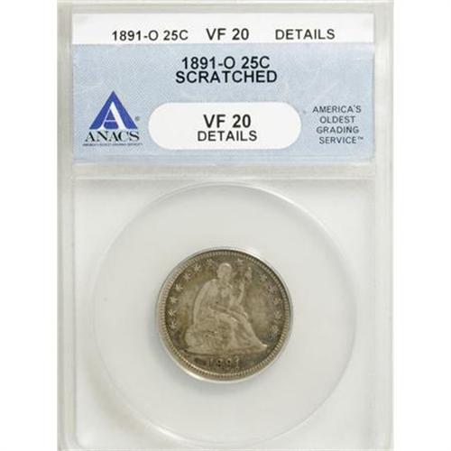 <B>1891-O 25C --Scratched--ANACS. VF20 Details.</B></I> NGC Census: (0/23). PCGS Population (1/28). Mintage: 68,000. Numismedia Wsl. Price for NGC/PCGS coin in VF20: $471. (#5525)<BR><BR><B>Coin Engraver:</B> Christian Gobrecht<BR><BR><b>Shipping:</b> Coins & Currency (<a target="_blank" href="http://www.heritageauctions.com/common/shipping.php">view shipping information</a>)