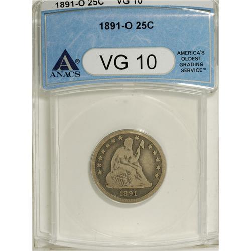 <B>1891-O 25C VG10 ANACS.</B></I> NGC Census: (0/34). PCGS Population (2/33). Mintage: 68,000. Numismedia Wsl. Price: $221. (#5525)<BR><BR><b>Shipping:</b> Coins & Currency (<a target="_blank" href="http://www.heritageauctions.com/common/shipping.php">view shipping information</a>)