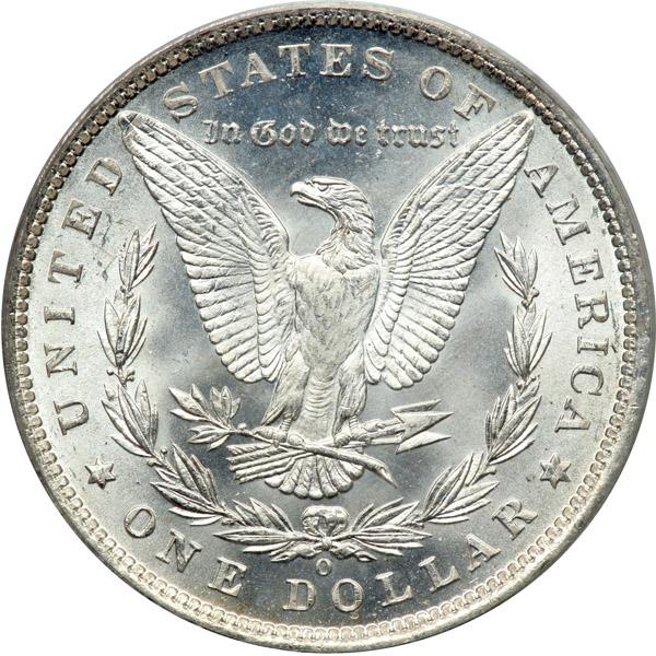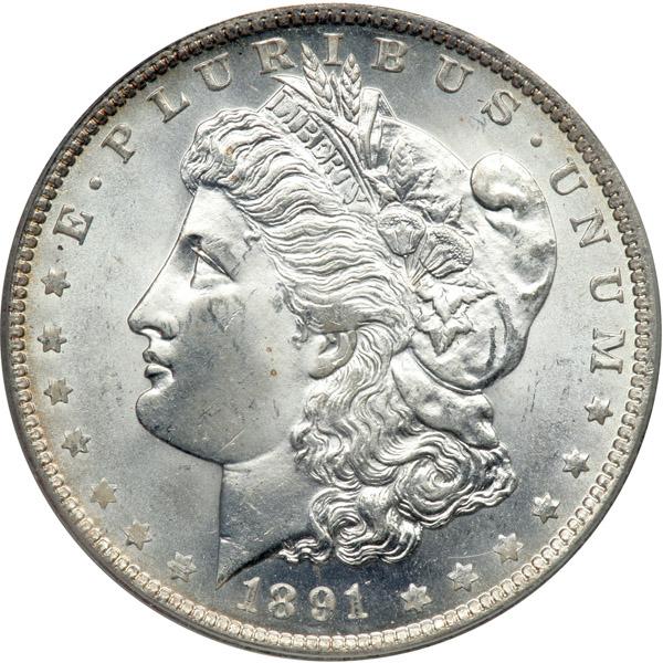 1891-O Morgan Dollar. PCGS graded MS-65. Housed in an Old Green Holder. Fully white and struck well for this date, the 1891-O is much scarcer in MS65 than the prior year's issue from New Orleans. By far the most visually fascinating feature of this coin is its soft, full frosted mint luster as it covers the cheek as well as inundates the fields. Full swirling cartwheel luster on both sides, in fact. Pop 75; 1 finer in 65+ (PCGS # 7208) .