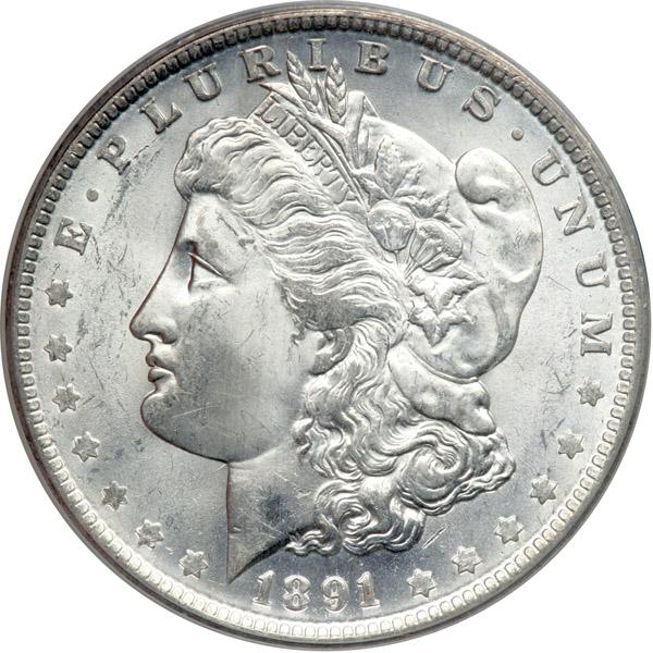 1891-O Morgan Dollar. PCGS graded MS-63. Fully white and softly struck in the centers as often occurs (PCGS # 7208) .