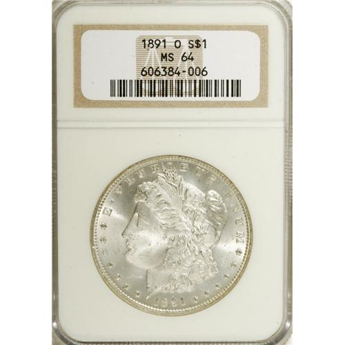 <B>1891-O S$1 MS64 NGC.</B></I> Choice and rather frosty with ice-blue patina in the fields. Minimally marked for the grade, though the centers exhibit the softness typical of this issue.<BR><BR><b>Shipping:</b> Coins & Currency (<a target="_blank" href="http://www.heritageauctions.com/common/shipping.php">view shipping information</a>)