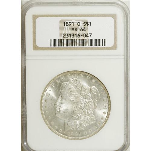 <B>1891-O S$1 MS64 NGC.</B></I> Silvery surfaces possess strong luster, and reveal a few grade-defining marks on the obverse. The design elements are well impressed, save for softness in the central areas.<BR><BR><b>Shipping:</b> Coins & Currency (<a target="_blank" href="http://www.heritageauctions.com/common/shipping.php">view shipping information</a>)