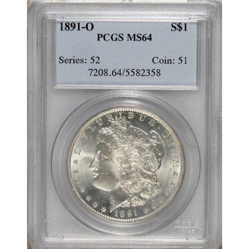 <B>1891-O S$1 MS64 PCGS.</B></I> The hair curl directly above the ear is incompletely defined, but the strike is good for a '91-O, which often comes with mushy centers. This lustrous near-Gem has faint milk-gray toning, and the cheek in particular is impressively unabraded.<BR><BR><b>Shipping:</b> Coins & Currency (<a target="_blank" href="http://www.heritageauctions.com/common/shipping.php">view shipping information</a>)