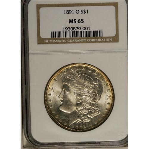 <B>1891-O S$1 MS65 NGC.</B></I> The surfaces of this well preserved Gem have a lovely soft appearance. They exhibit cartwheel luster, yet appear satiny as well as frosty, as light rolls over the features of their famous, elegant design. Some gentle golden-russet patina gradually deepens toward the borders. Any grazes or blemishes are minor, and do little to detract from the delightful eye appeal of our specimen. NGC has only certified two finer examples (10/06).<BR><BR><b>Shipping:</b> Coin/Currency (<a target="_blank" href="http://www.heritageauctions.com/common/shipping.php">view shipping information</a>)