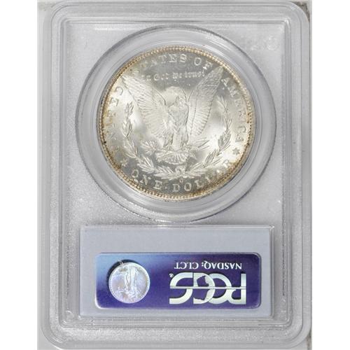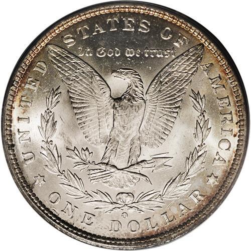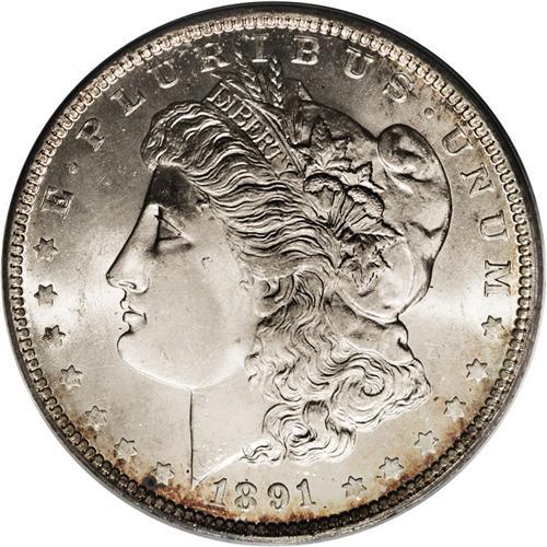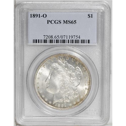 <B>1891-O<img border='0' src='http://www.heritagecoins.com/images/star.gif' width=10 height=10>$1> MS65 PCGS.</B></I> This is an important Gem quality example for its sharp strike. Although the hair details over Liberty's ear and the eagle's breast feathers are not fully defined, both characteristics are much sharper than usually seen. The obverse and reverse surfaces of this Gem have frosty silver luster with attractive peripheral gold and iridescent toning. Tied for the finest certified by PCGS. Population: 69 in 65, 0 finer (8/06).