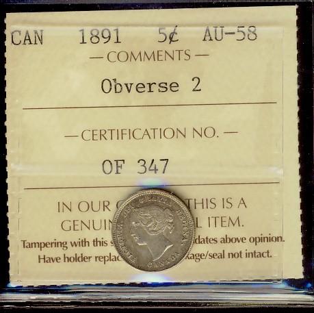 1891 Obv. 2 5¢ ICCS AU58, nice with attractive toning.