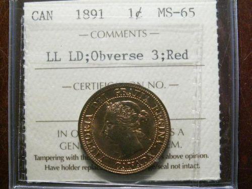 1891 Obv.3 LDLL 1¢ ICCS MS65 Red. Amazing lustre, excellent strike and great fields. Underrated date!